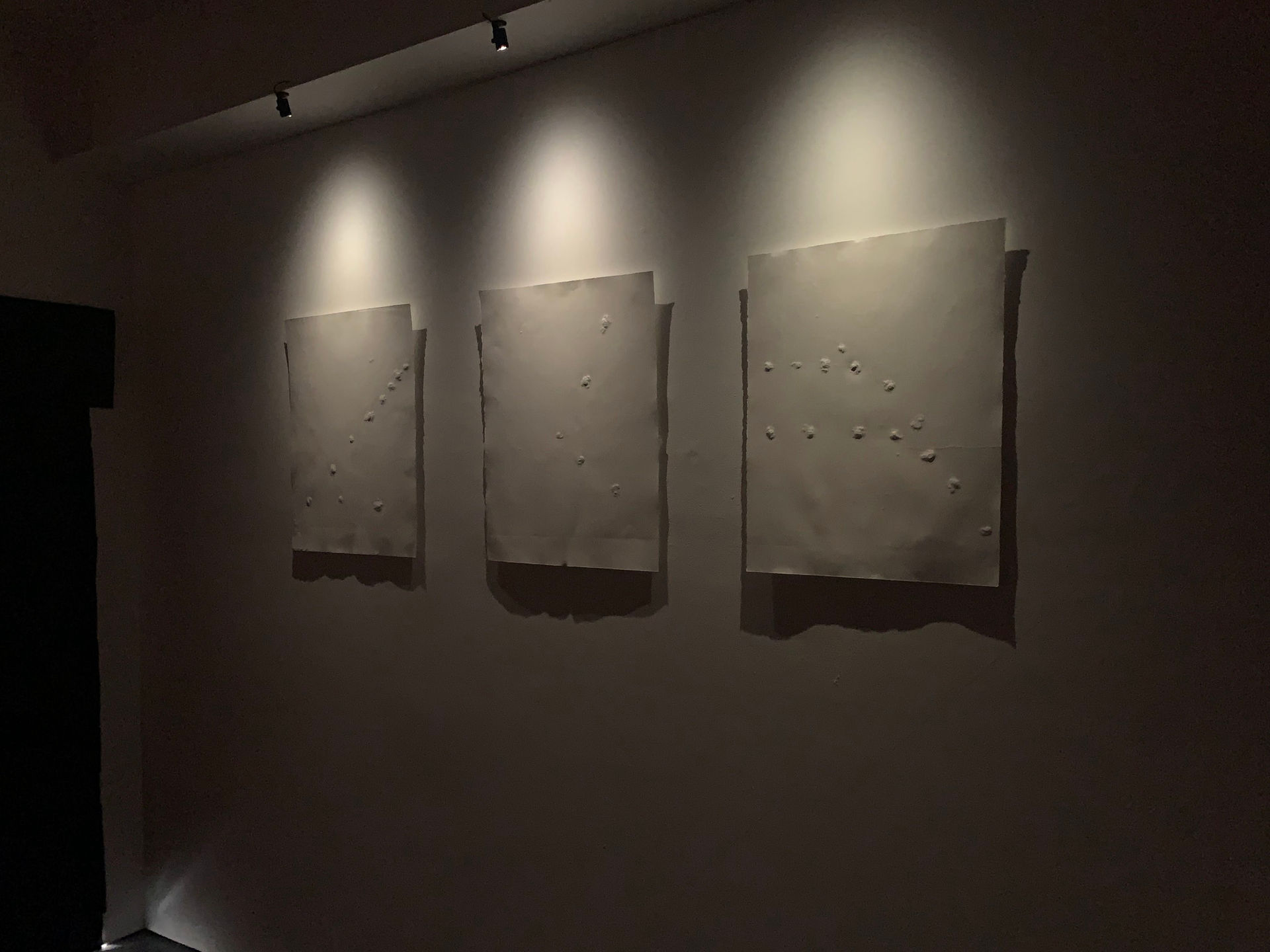 Nineteen prints speculatively map out aerial views of qanat systems using Asgary's breath to emboss cotton rag paper. The prints touch upon power systems of labor, with references to land and body. To create these, Asgary continuously blew into plaster until set, forming a crater, and cast a mold using consumer-grade plastic melted down from water bottles, which she then intricately wrapped in layers of tarlatan and organza to create subtle variations on the paper's surface when embossed onto cotton rag paper with a hydraulic press. Asgary views the creation of these speculative maps as a process akin to a psychomagic act of breathing water over the landscape. These prints were created through her ongoing research into the water systems of Iran and through her self-training in identifying idealized locations for qanats by looking at google maps and realized while in residence at MASS MoCA with the support of an Emergency Grant from the Foundation for Contemporary Arts.